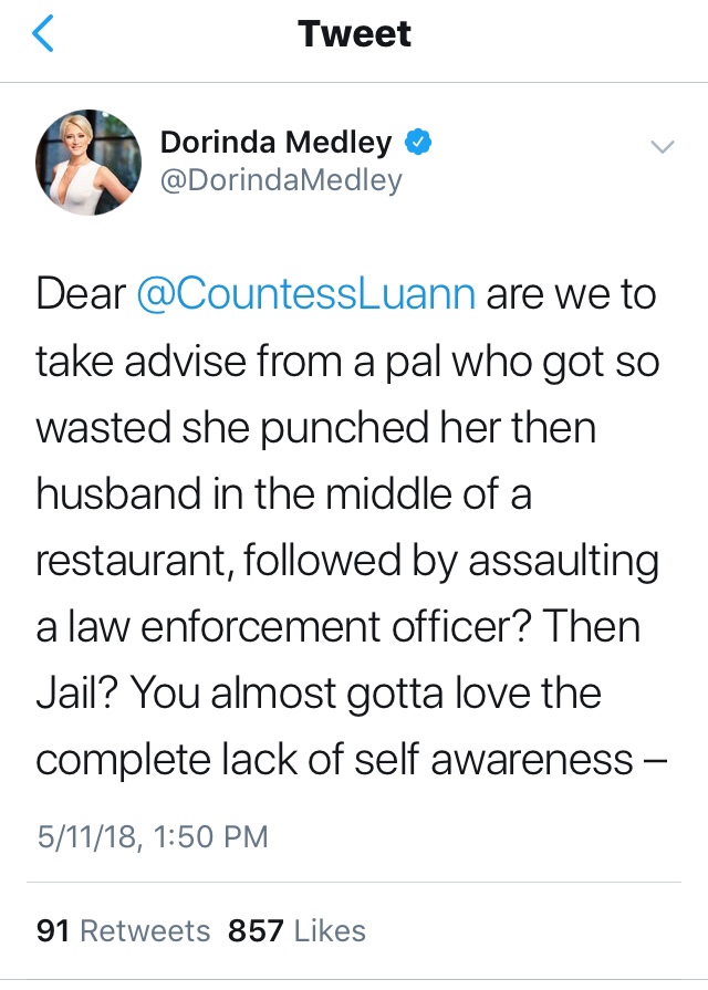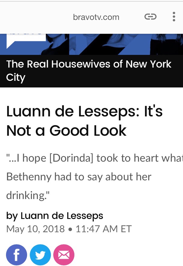 Luann took to her blog to convey that she hopes Dorinda took Bethenny’s critique about her drinking to heart and internalized it. It seems that Lu’s remarks and her loyalty to Sonja are maximally irksome to Dorinda. So Dorinda is biting back. On Twitter, she shared the sentiment of how people in glass houses shouldn’t throw stones. As Dorinda privately remarked to me: “I think my tweet says it all, don’t you?”