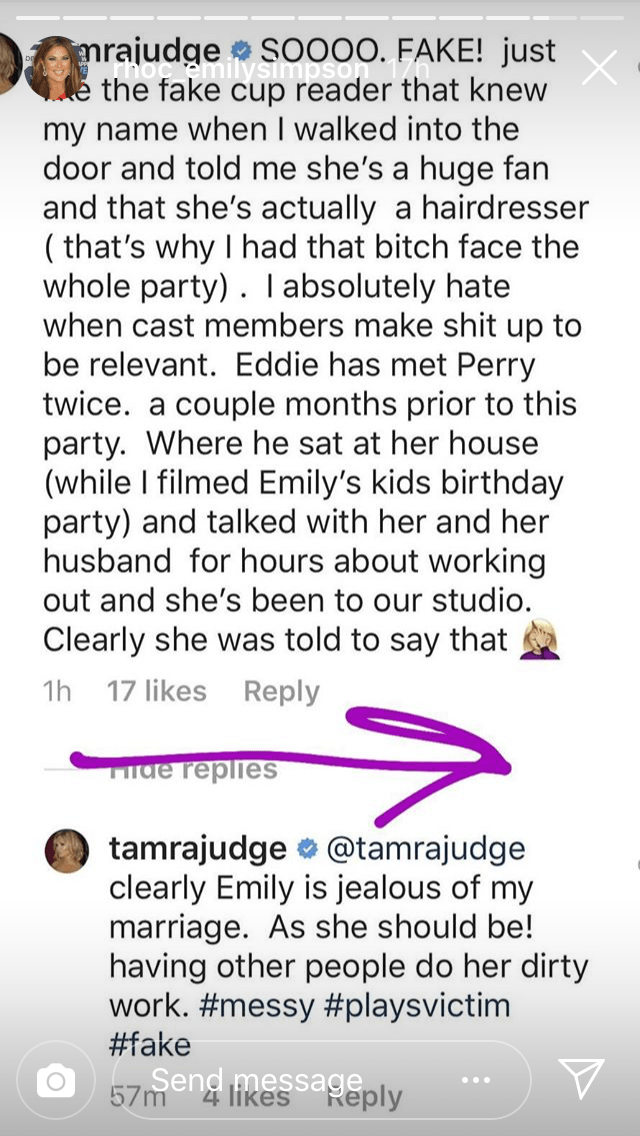 “Where has THIS Emily been all season?!” one commenter in a Bravo-focused Facebook group wrote. His remark was in response to a social media argument that heated up between Real Housewives of Orange County cast mates Tamra Judge and Emily Simpson. The group consensus was that Emily had successfully told an aggressive Tamra off. “I’m wondering what transpired at the RHOC reunion,” another Facebook user replied, “Whatever it was had to be the catalyst for this angry back and forth.”