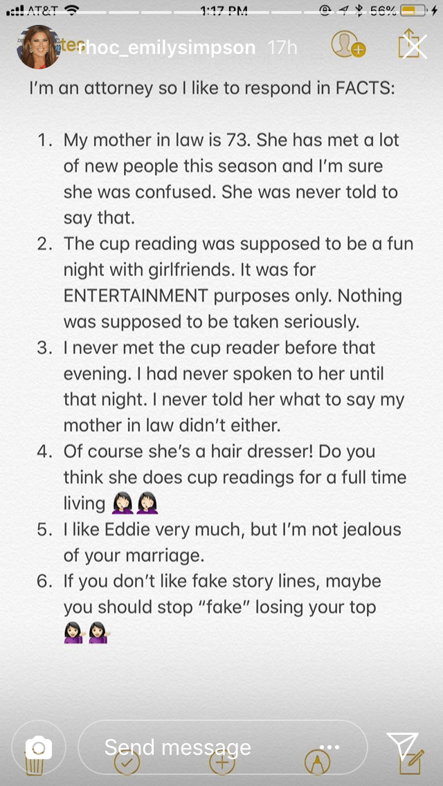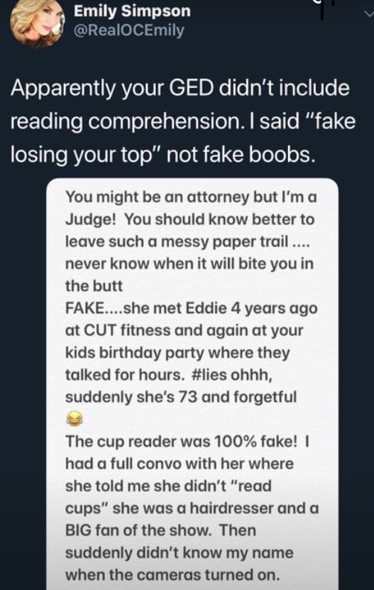 I think she handled Tamra properly and I hope she realizes that she effectively got the last word in their terse social media exchange (pictured above). I think she can spend today feeling content. From a production standpoint, and as one still rooting for the longevity of this franchise, Evolution Media can use the above exchanges in their opening footage sequence next season. As many viewers have opined on Twitter and Instagram, Emily has solidified that she’s earned the right to a spot as “Housewife” next season.